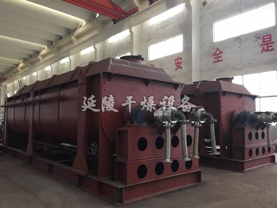 空心双轴双桨叶干燥机,可对浆状、膏状、颗粒状、粉状物料间接加热干燥。该设备是间接加热搅拌型干燥器,在筒体上设置夹套,旋转的轴是中空的,轴上设置空心桨叶并与空心轴连通。这样设计既提高了单位体积的使用面积,又强化了传热过程,提高了传热效率。桨叶干燥机的壳体为Ω型,壳体内一般为二根空心搅拌轴,壳体有密封端盖与上盖,防止物料粉尘及热源外泄。