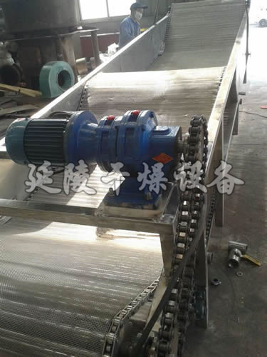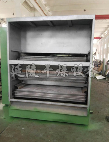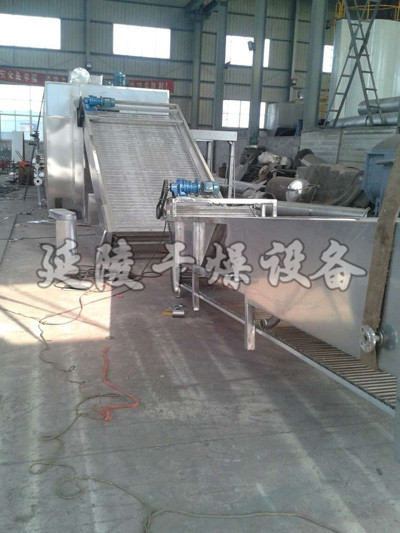 将所要处理的物料通过适当的加料机构(如星型布料器、摆动带、粉碎机或造粒机),分布在输送带上,输送带通过一个或几个加热单元组成的通道,每个加热单元均配有空气加热和循环系统,每一个通道有一个或几个排湿系统,在输送带通过时,热空气从上往下或从下往上通过输送带上的物料,从而使物料能均匀干燥。