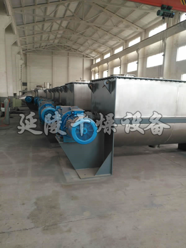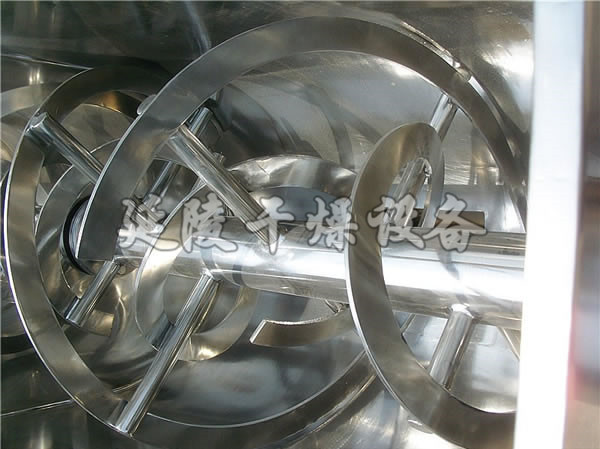 该机型由容器、螺旋搅拌叶片和传动部件组成;螺旋叶片一般做成双成或三层,外层螺旋将物料从两侧向中央汇集,内层螺旋将物料从中央向两侧输送,形成对流混合。