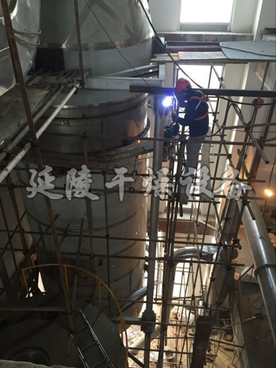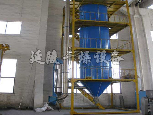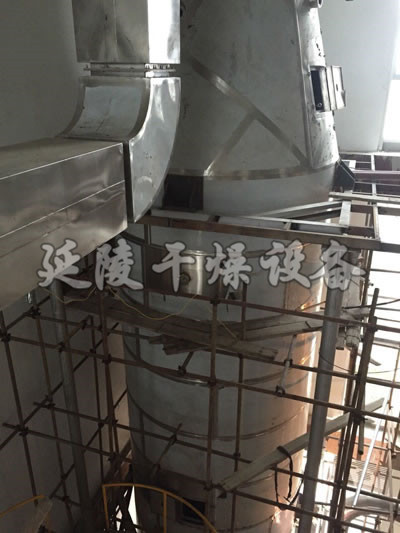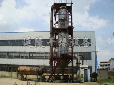 本机组工作过程为:料液通过隔膜泵高压输入,喷出雾状液滴,然后同热空气并流下降,大部分粉粒由塔底排料口收集,废气及其微小粉末经旋风分离器分离,废气由抽风机排出,粉末由设在旋风分离器下的收粉筒收集,风机出口处还可装备二级除尘装置,回收率在96%-98%。