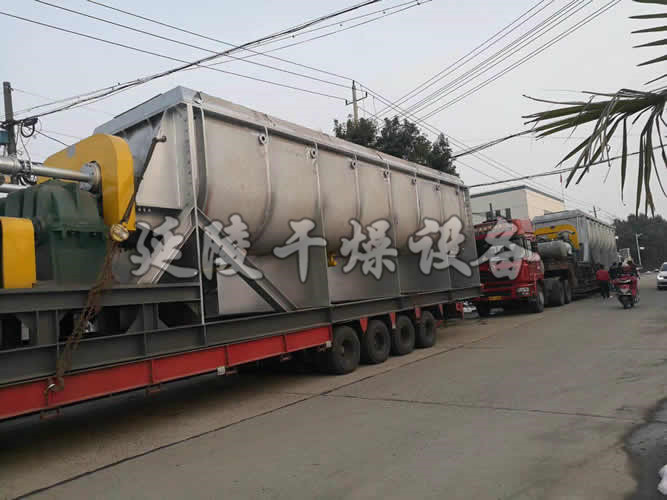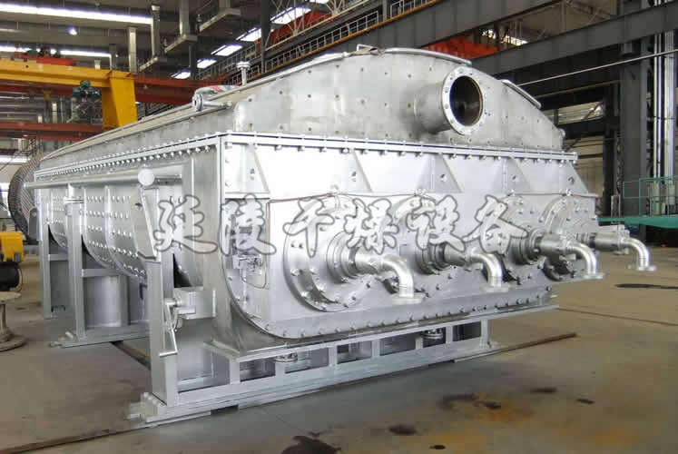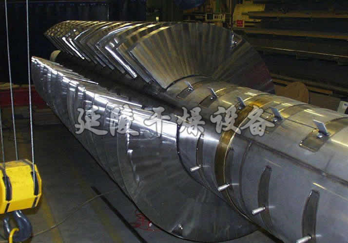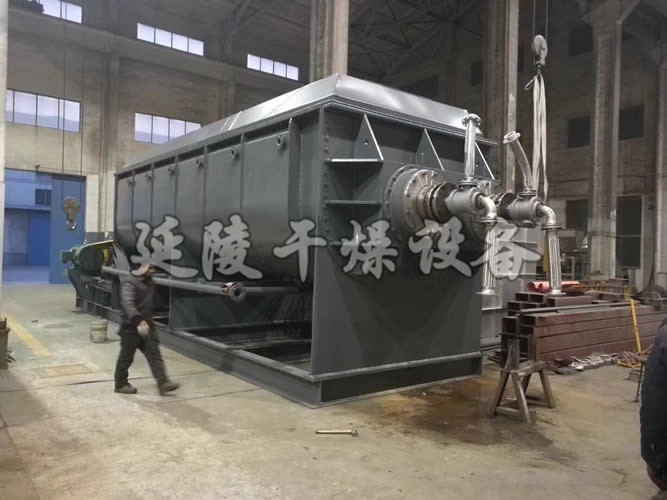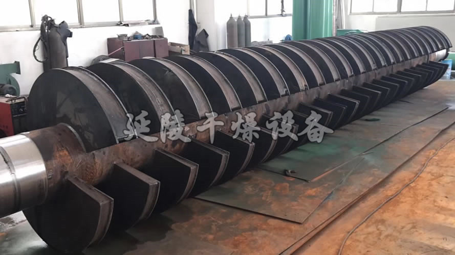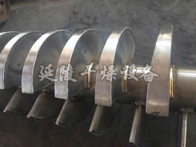 设备的核心是两根空心轴和焊在轴上的空心搅拌桨叶。桨叶形状为楔形的空心半圆形,可以通入加热介质。除了起搅拌作用外,也是设备的的传热体。桨叶的两主要传热侧面成斜面,因此当物料与斜面接触时,随着叶片的旋转,颗粒很快就从斜面滑开,使传热表面不断更新,强化了传热。在桨叶的三角形底部设有刮板,以将沉积于壳底的物料刮起,防止产生死角。