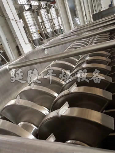 桨叶的排布和各部位尺寸均有一定要求,而且在进料区、干燥区、排料区除桨叶外,另设有辅助机构,以保证整机操作稳定,干燥均匀。此外,停留时间亦可调节。