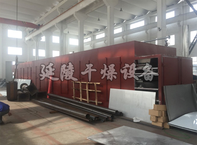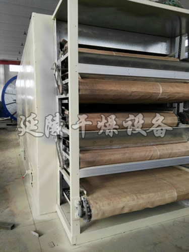 将所要处理的物料通过适当的加料机构(如星型布料器、摆动带、粉碎机或造粒机),分布在输送带上,输送带通过一个或几个加热单元组成的通道,每个加热单元均配有空气加热和循环系统,每一个通道有一个或几个排湿系统,在输送带通过时,热空气从上往下或从下往上通过输送带上的物料,从而使物料能均匀干燥。