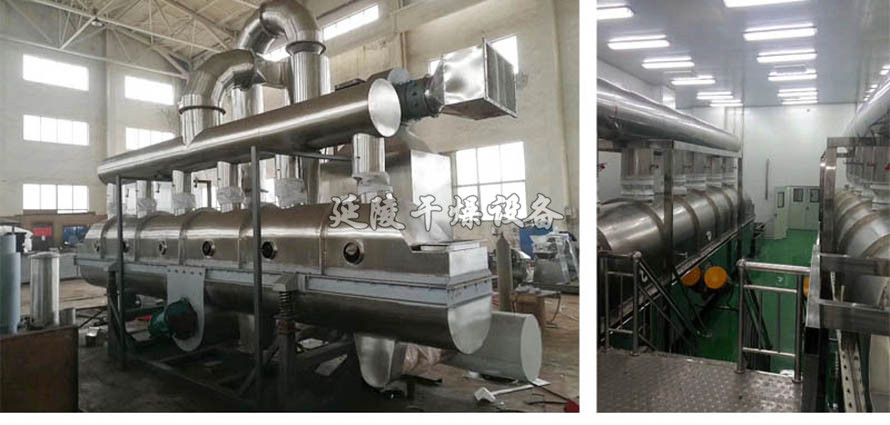 2、该生产线的核心部分:干燥系统。采用分段加热的方式,预干燥段采用高压低风量风机,使较湿的鸡精颗粒能完全流化;干燥段采用低压高风量的风机,单位时间内带走水份多,干燥均匀;冷却段采用高风量风机,能迅速带走热量,降低产品温度,既达到水分控制的要求,又方便后续包装工艺。